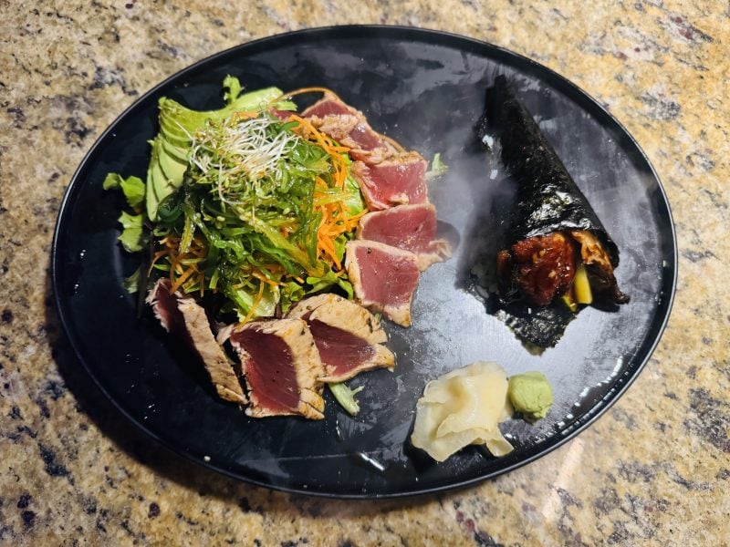 To get the palate going, popcorn drizzled with daily made, divine kimchi butter was served. The tender charred octopus with fresh papaya and mango chunks and Peruvian sweet drops was splendid. The bursting-with-flavor eel hand roll and uber-fresh ahi tataki salad with ponzu sauce were both marvelous. Ending the meal uniquely, a tower of nostalgic, fluffy cotton candy was brought to my table. It would’ve made Barnum & Bailey very jealous had either tasted it.