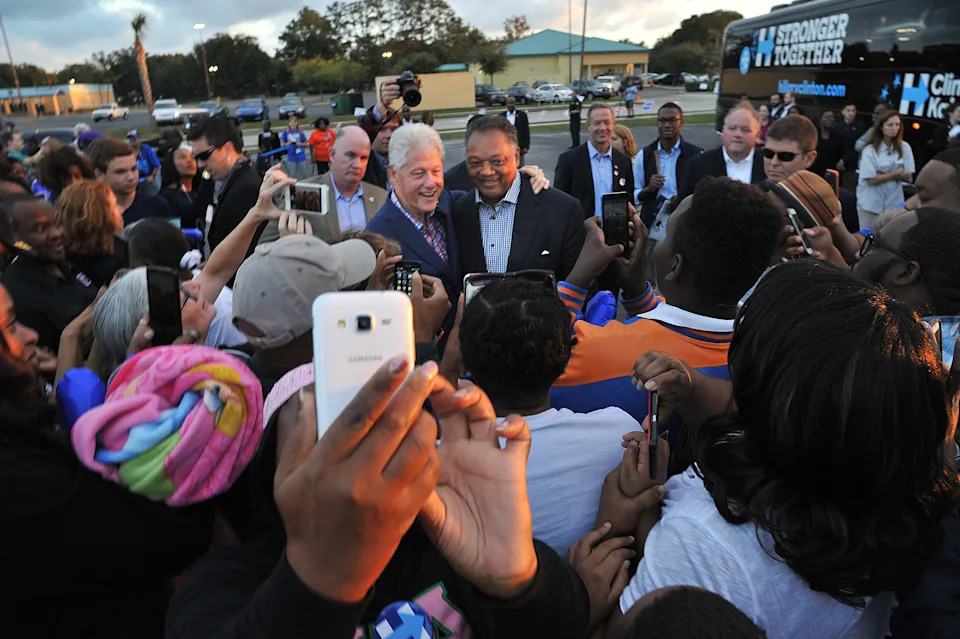 The Rev. Jesse Jackson, right, joins former President Bill Clinton, at a last minute campaign stop in Jacksonville for presidential candidate Hillary Clinton at the Gateway Mall.