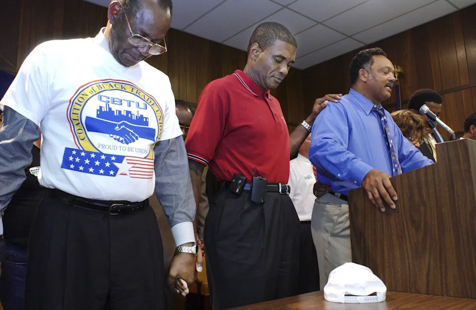 William Lucy, left, Secretary Treasurer of AFSCME, and Tony Hill join Rev. Jesse Jackson in prayer at the International Brotherhood of Electrical Workers union hall on Liberty Street. Jackson was in Jacksonville to stump for Hill and other Democratic candidates.