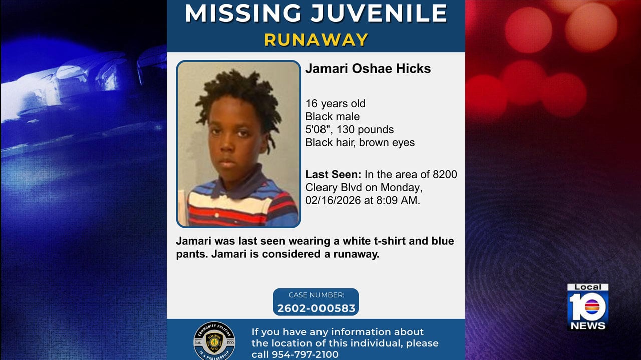 Jamari Oshae Hicks, a runaway, vanished on Monday morning in the area of 8200 Cleary Boulevard, according to the Plantation Police Department.