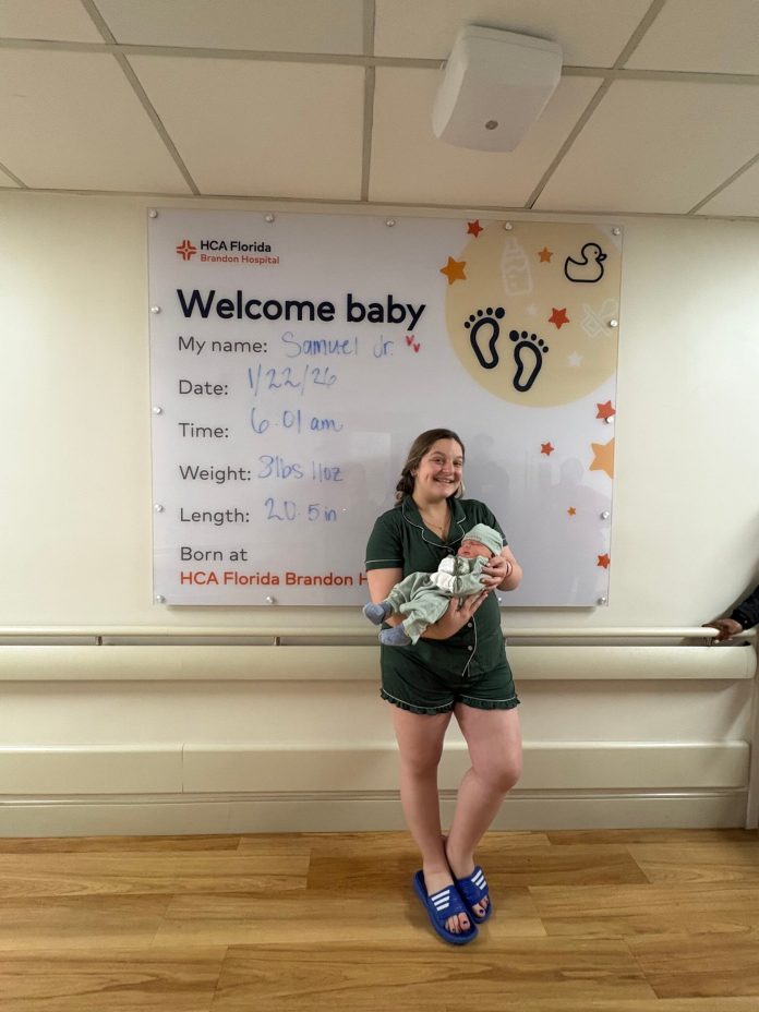 On January 21, Chandler and her husband welcomed their son, Samuel Jr., at Brandon Hospital. A photo taken in front of the hospital’s Welcome Baby wall marks the moment with the same type of birth announcement display that once recorded Chandler’s own arrival into the world.