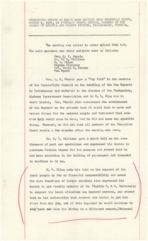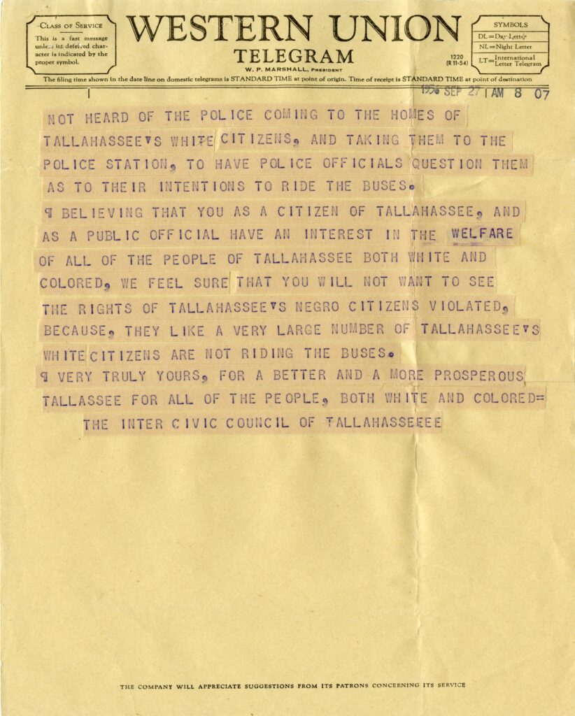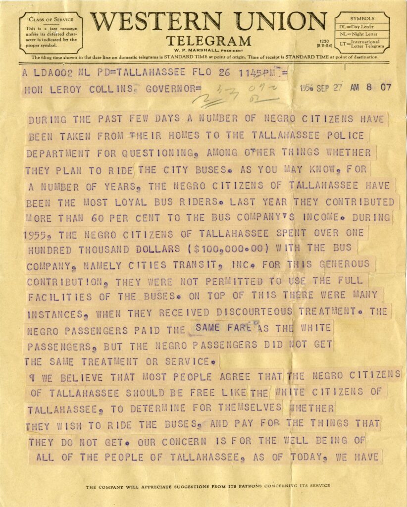 “During 1955, the Negro citizens of Tallahassee have spent over 100,000 with the bus companies,” the message read. “We believe that most people agree that the Negro citizens of Tallahassee should be free like the white citizens of Tallahassee, to determine for themselves whether they wish to ride the buses and pay for the things they do not get.”