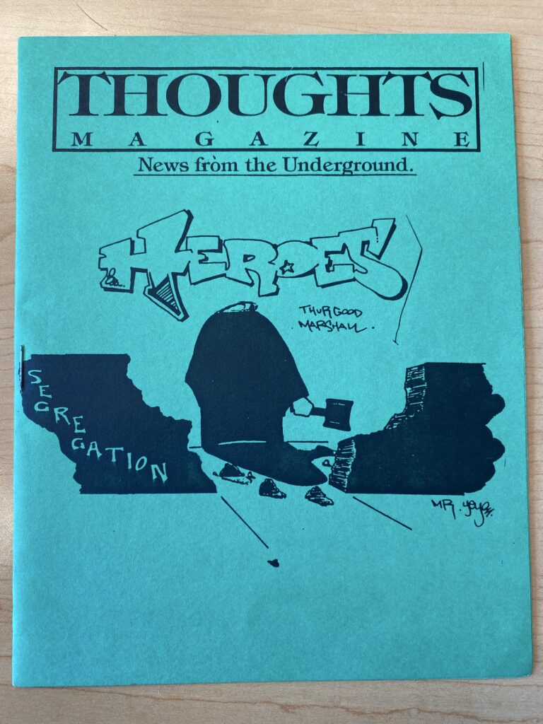 Black History Month edition of “THOUGHTS Magazine”, featuring a cartoon about Thurgood Marshall on the cover. (Zaccai Free)