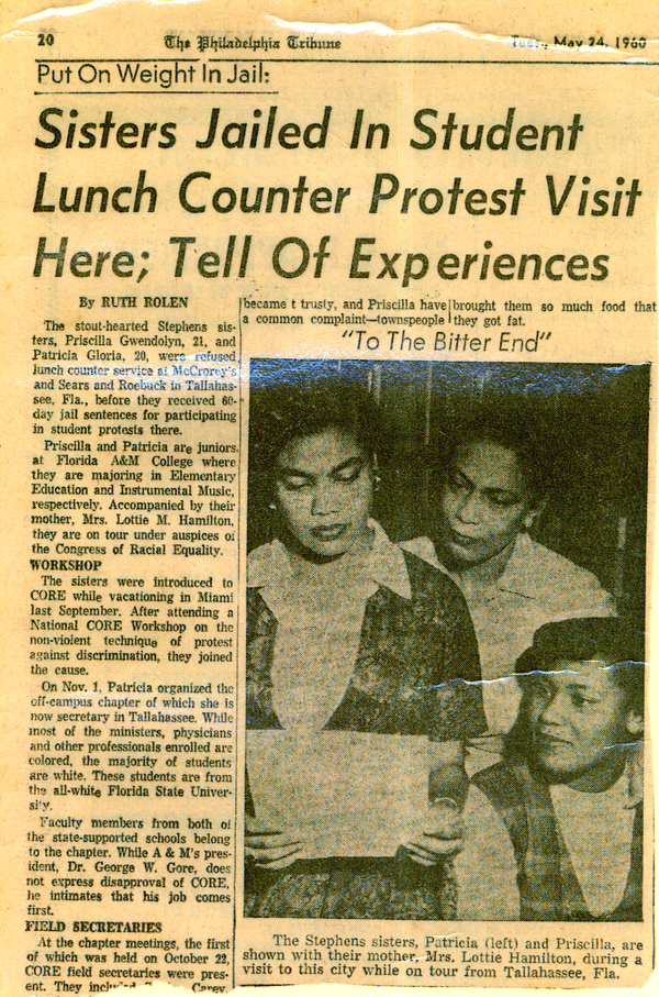 A headline in The Philadelphia Tribune from May 24, 1960, about FAMU students, and sisters, Priscilla Stephens Kruize and Patricia Stephens Due while on a national tour sponsored by the Congress of Racial Equality. The students held a “jail-in” where the pair spent 49 of their 60-day sentence in the Leon County jail after refusing to pay a $300 fine they received after a non-violent sit in protest at the Woolworth’s lunch counter.
