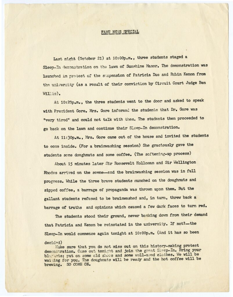 In retaliation, FAMU students held a sleep-in to protest the suspension at the home of university president at the time, George W. Gore.
