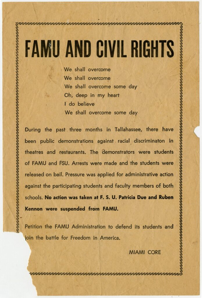 In a 1963 leaflet published by the Miami chapter of CORE, the organization urges readers to “Petition the FAMU administration to defend its students and join the battle for Freedom in America,” as Patricia Stephens Due had been suspended from the university following three months of demonstration in Tallahassee.