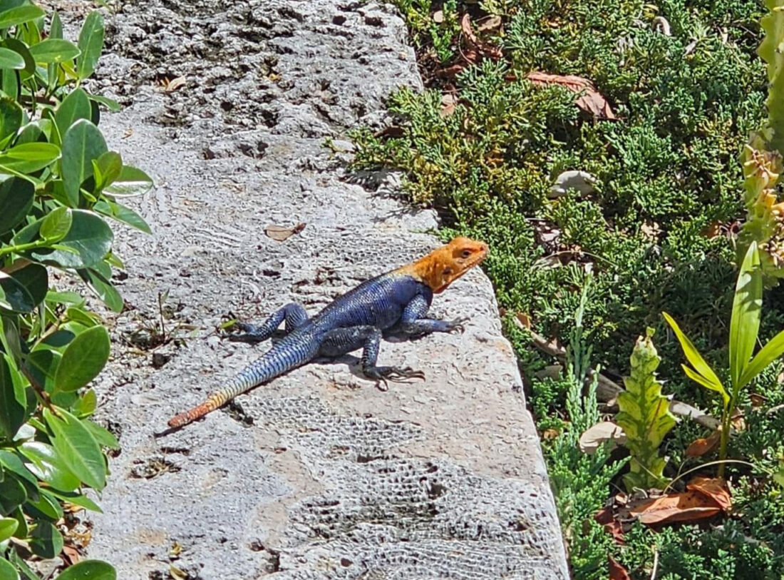Peter’s rock agama was first found on Sanibel in May 2006. The males are brightly colored lizards with an electric blue body, and red/orange heads and tails, which makes many people take a second look because they look foreign to the area.