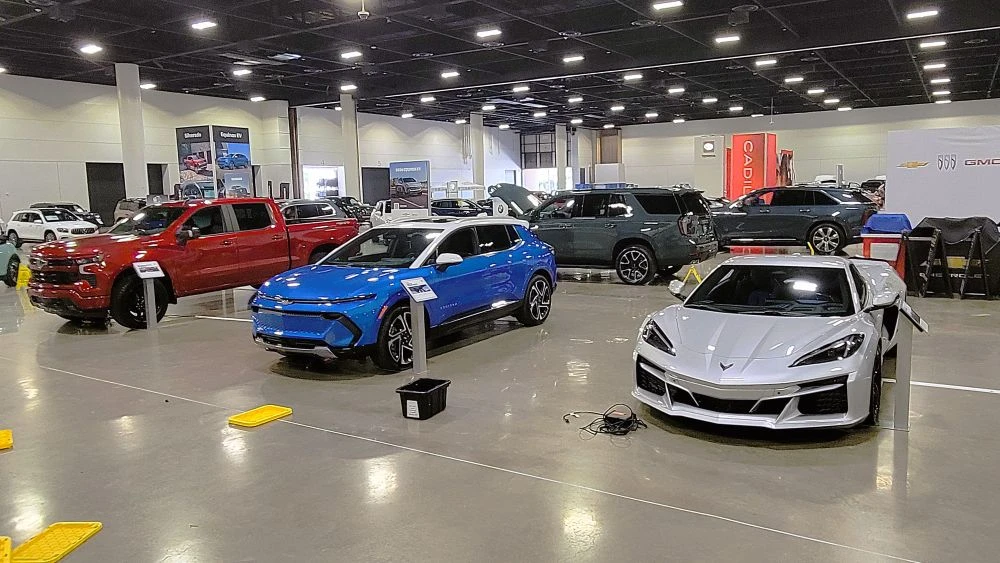 As dealers set up displays, the Chevrolet stand at the auto show includes, from left, a Silverado pickup, Blazer EV, and C8 Corvette. | Dan Scanlan, Jacksonville Today