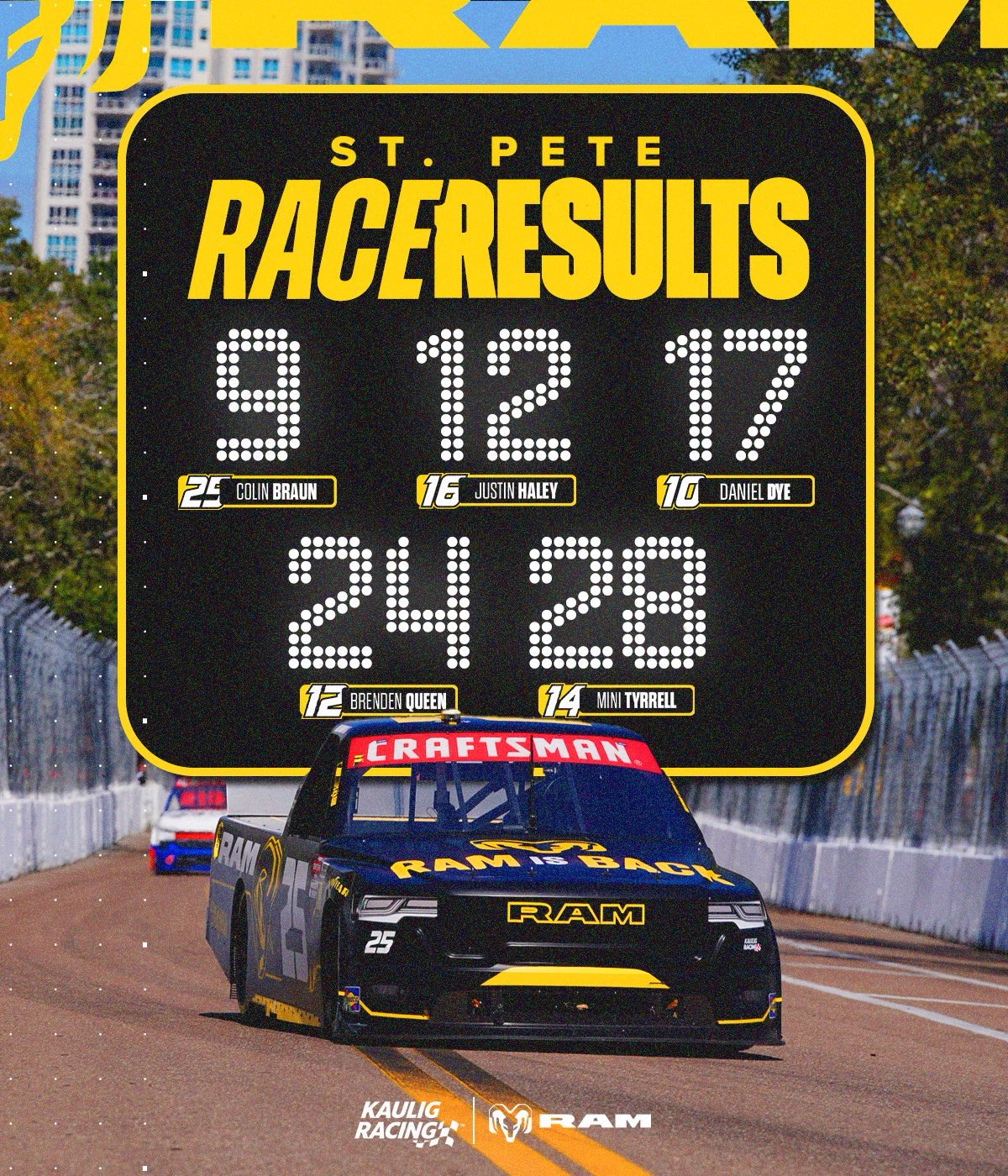 When the dust settled on the streets of St. Pete, it was “Free Agent” Colin Braun who led the Ram charge, delivering a solid ninth-place finish and keeping Ram’s top-10 streak alive to start the season.