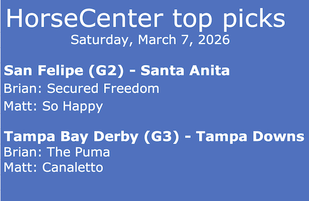 Matt: Further Ado is a deserving favorite in the signature race at Tampa. My only reservation about him is that he is making his 2026 debut on the first Saturday in March, which will be only 56 days from the Kentucky Derby. I too will take a chance to beat that Brad Cox runner. Chad Brown is having excellent results on the Derby trail. He has Canaletto entered at Tampa. He debuted impressively going a mile in January and stayed in Florida to prepare for this spot. Canaletto is my top pick at Tampa.