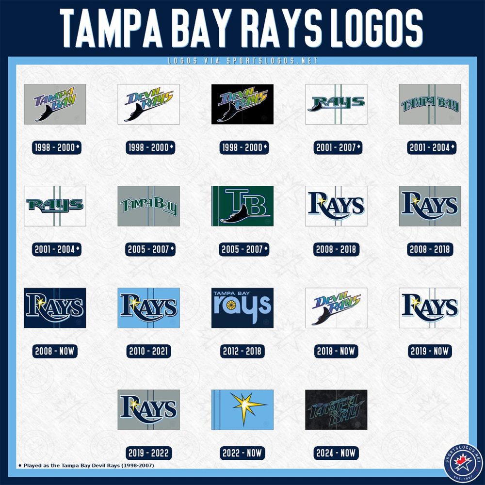 The different logos the Tampa Bay Rays have worn on the front of their jerseys from 1998 to 2026