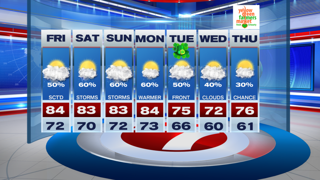 Looking ahead, the unsettled pattern continues into Sunday and Monday with more rounds of showers and storms possible. A stronger cold front is expected to move through by Tuesday, bringing cooler air with highs dropping into the 70’s and lows in the 60’s later in the week.