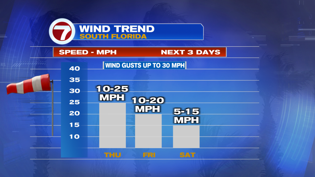 Here’s a look at the weather map as we get more separation from a stationary Front to our south and east. What will build our way? High Pressure centered over the Gulf waters. It’s worth noting that the difference in air pressure will get winds stirring stronger. Winds are expected to gust as high as 30 miles per hour, for the short term.