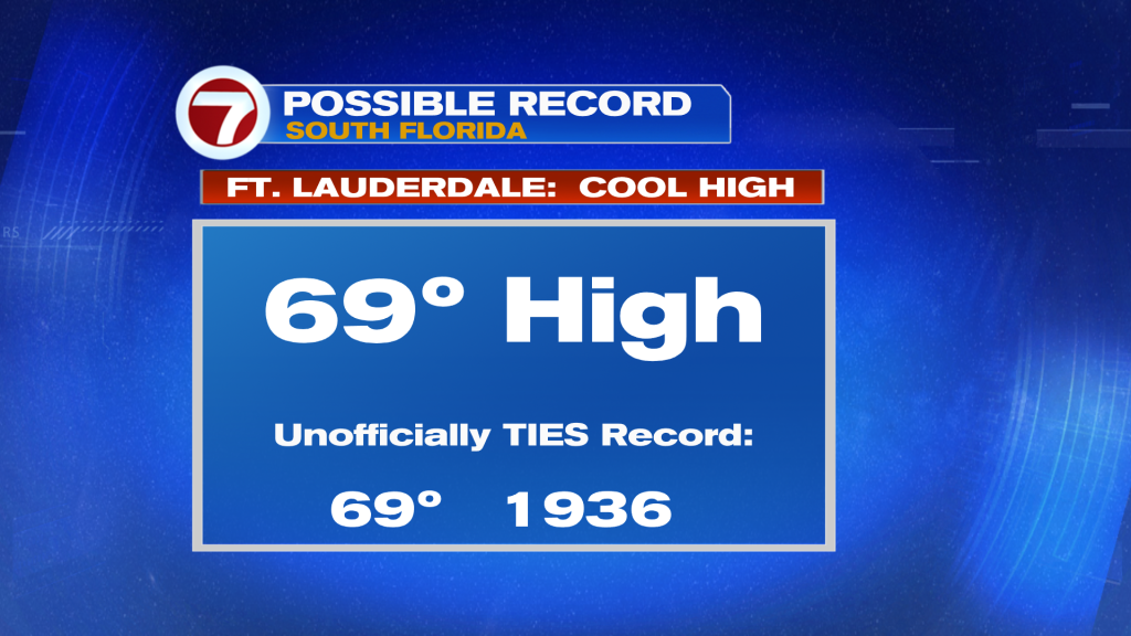 The hovering clouds held temperatures down, making for a cool day by south Florida standards. Morning readings started in the 50’s with the afternoon “stuck in the 60’s”. Interestingly, that appears to be enough to get us into the record books! Although still unofficial at this time, our data suggests Ft. Lauderdale matched the coolest daytime high for the date (at 69-degrees).