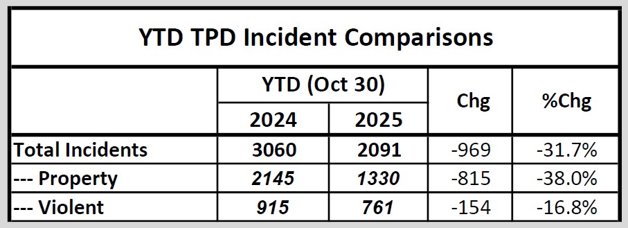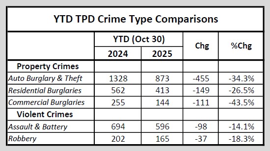 Through October, crime incident data published daily by the Tallahassee Police Department shows that total crime incidents have declined by 31.7% when compared to incident data from January thru October in 2024. The drop was driven by a 43.5% decline in commercial burglaries and a 34.3% decline auto related crime incidents.