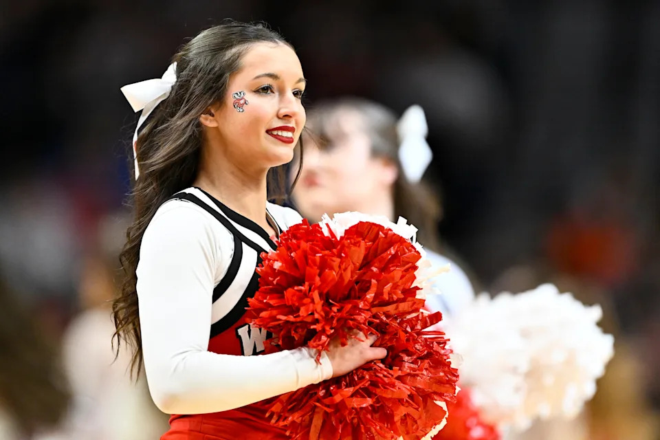 A Wisconsin Badgers cheerleader performs during the first half of a first round game of the men’s 2026 NCAA Tournament against the High Point Panthers at Moda Center on March 19, 2026 in Portland, Or.