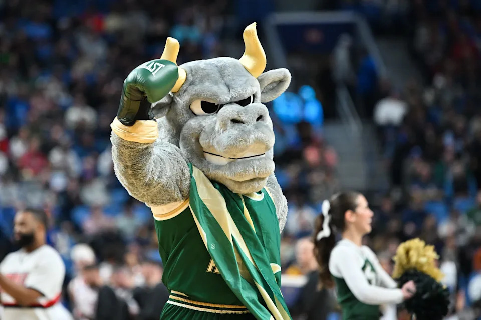 The South Florida Bulls mascot performs during the second half against the Louisville Cardinals during a first round game of the men’s 2026 NCAA Tournament at Keybank Center on March 19, 2026 in Buffalo, NY.