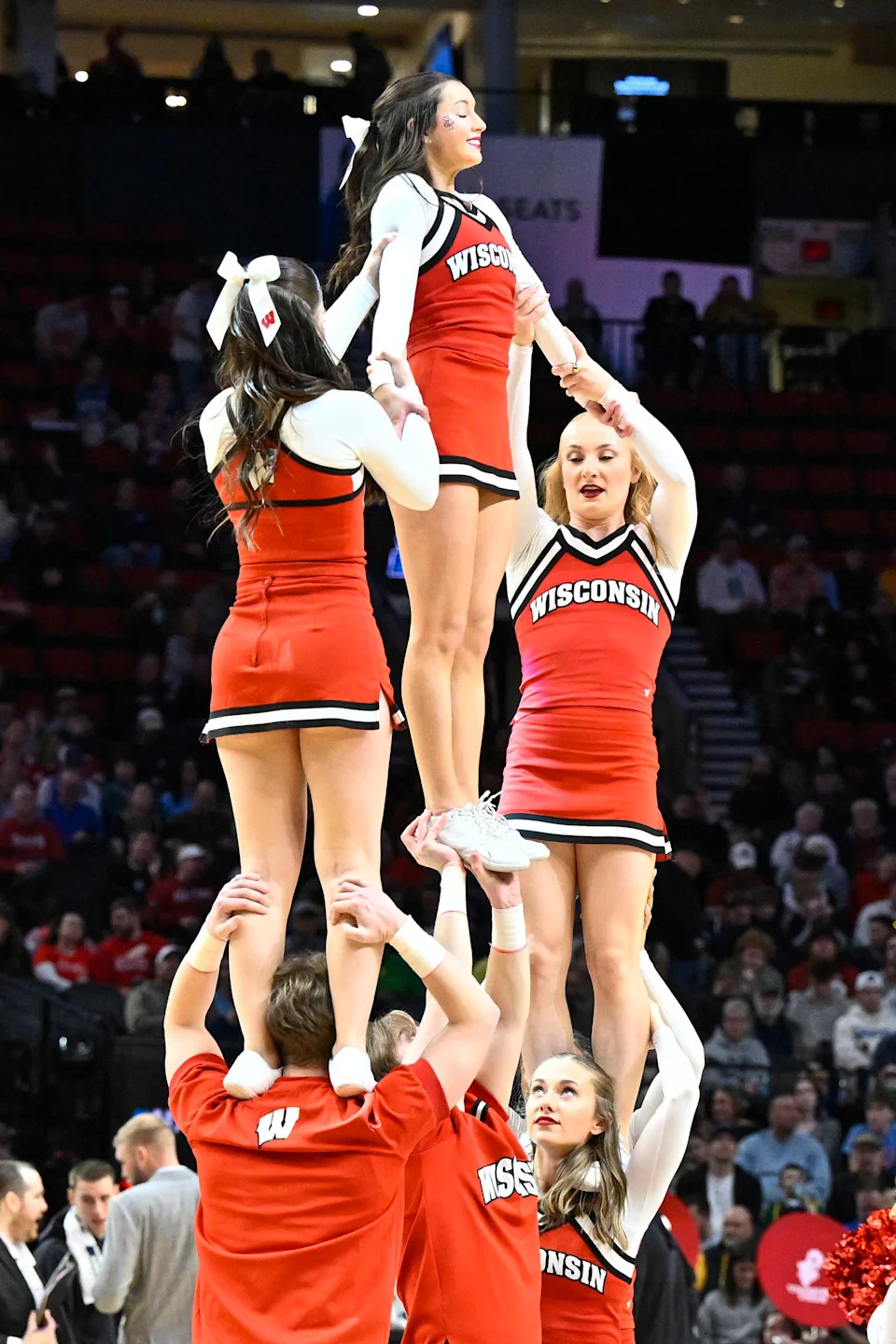 The Wisconsin Badgers cheerleaders preform during the first half of a first round game of the men’s 2026 NCAA Tournament against the High Point Panthers at Moda Center on March 19, 2026 in Portland, Or.