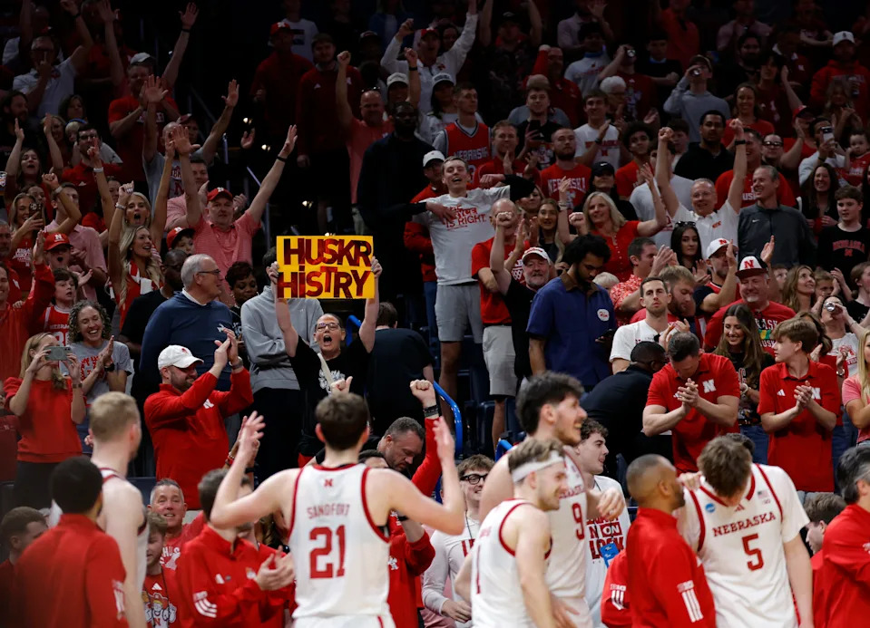 Nebraska Cornhuskers fans cheer after defeating the Troy Trojans during a first round game of the men’s 2026 NCAA Tournament at Paycom Center on March 19, 2026 in Oklahoma City.