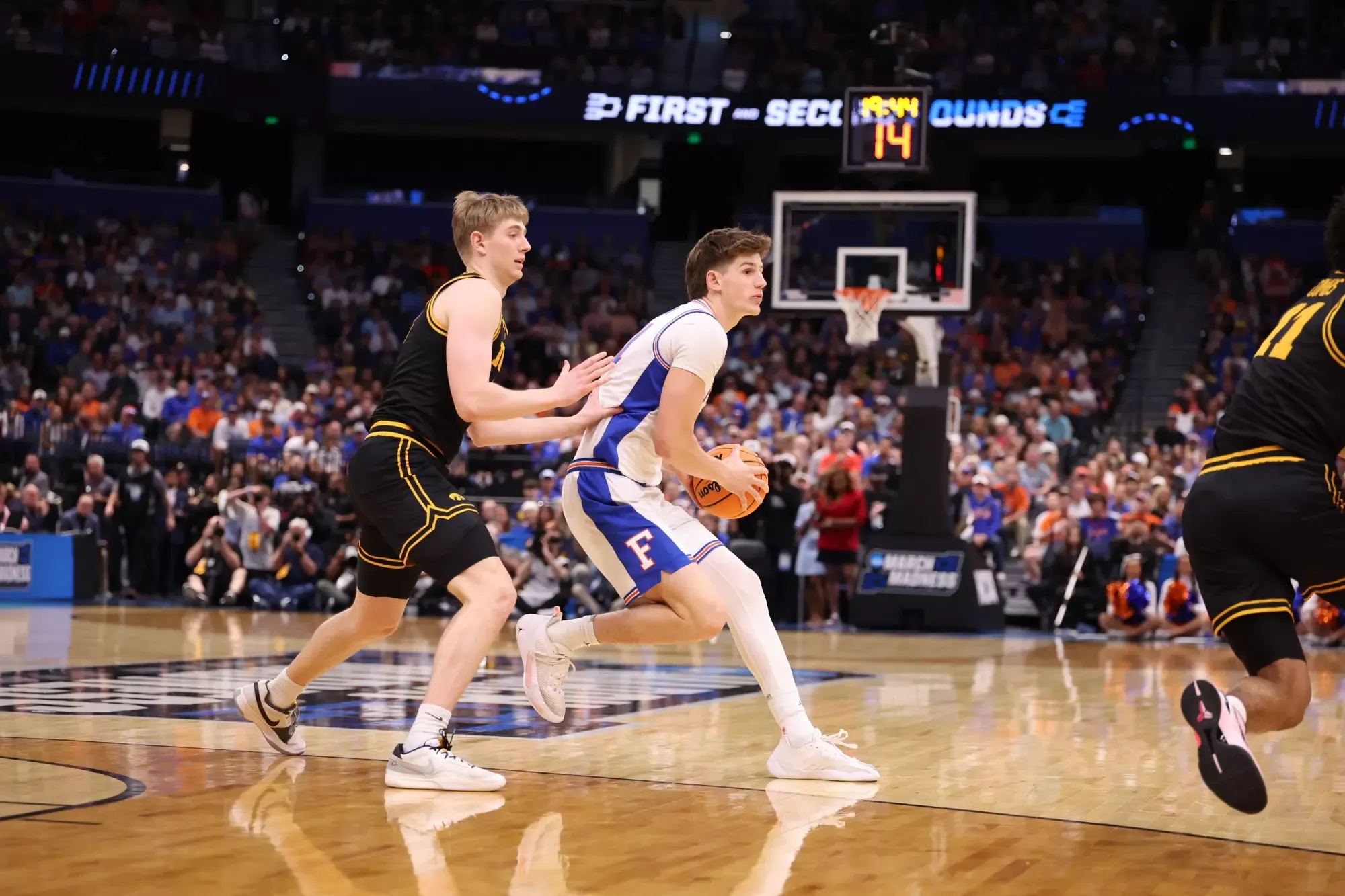 TAMPA, Fla. – Iowa forward Alvaro Folgueiras nailed a 3-pointer with 4.5 seconds to play and the ninth-seeded Hawkeyes shocked top-seeded and reigning national champion Florida 73-72 in second-round play Sunday night of the NCAA Tournament Southeast Region at Benchmark International Arena, ending the Gators’ run as reigning national champions.Â