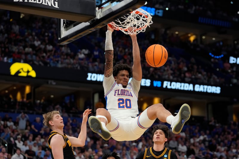 Florida guard Isaiah Brown (20) slam dunks over Iowa forward Cooper Koch and guard Isaia Howard during the second half in the second round of the NCAA college basketball tournament Sunday, March 22, 2026, in Tampa, Fla. (AP Photo/Chris O’Meara) Florida guard Boogie Fland, right, drives around Iowa guard Kael Combs (11) during the first half in the second round of the NCAA college basketball tournament, Sunday, March 22, 2026, in Tampa, Fla. (AP Photo/John Raoux)