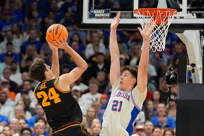 Iowa forward Cooper Koch (8) celebrates a three-point shot during the second half in the second round of the NCAA college basketball tournament against Florida Sunday, March 22, 2026, in Tampa, Fla. (AP Photo/Chris O’Meara) Iowa guard Tate Sage (24) shoots over Florida forward Alex Condon (21) during the first half in the second round of the NCAA college basketball tournament, Sunday, March 22, 2026, in Tampa, Fla. (AP Photo/John Raoux)