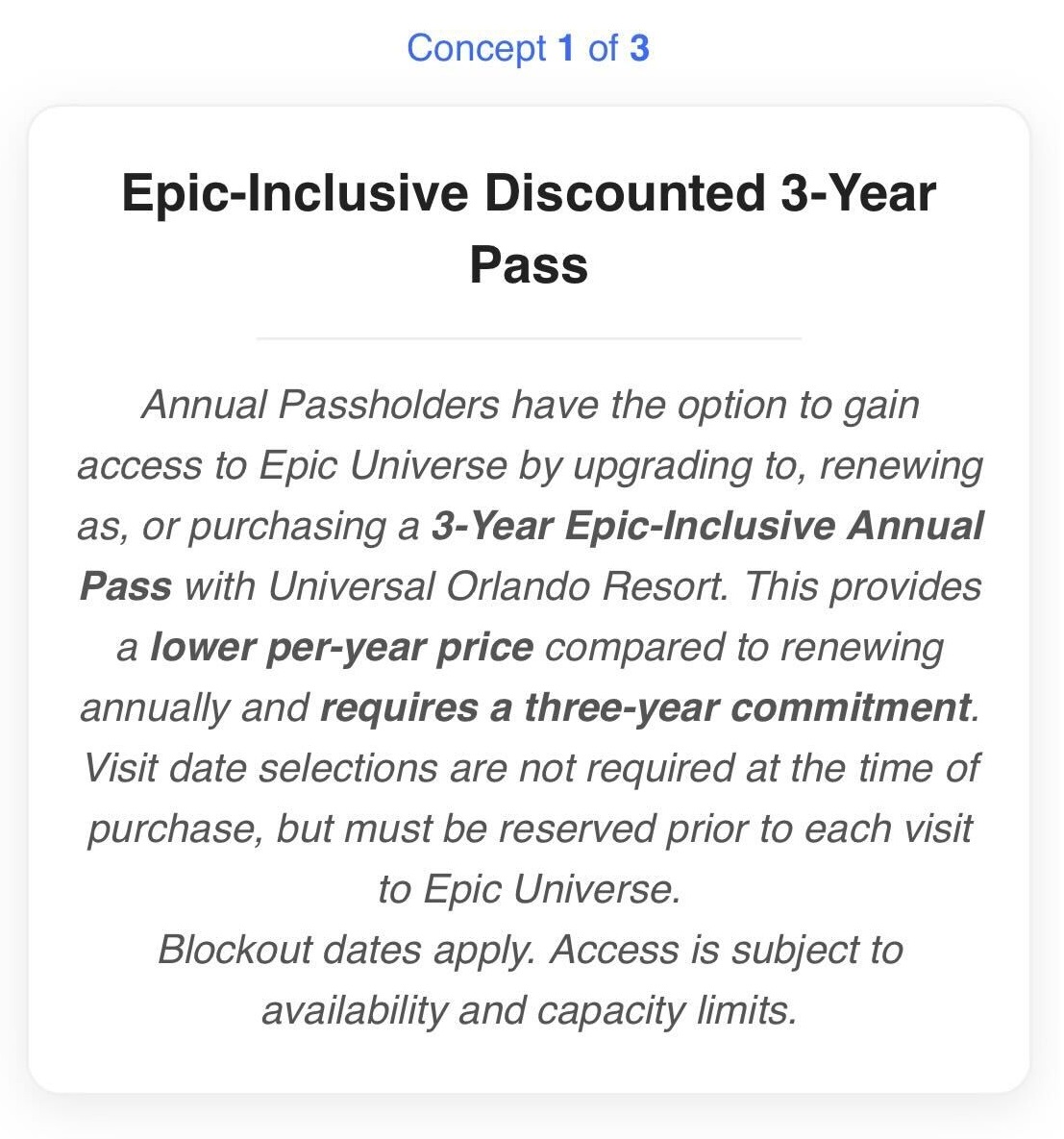 The first concept presented is an annual pass that includes Epic Universe access, but you are committed to the pass for three years. This supposedly results in a lower per-year price than if it were to be renewed annually. Reservations would be required for each visit, and blockout dates apply.