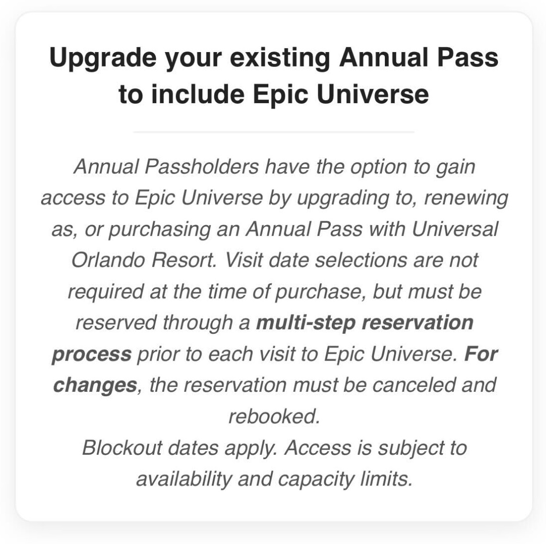 Annual Passholders have the option to gain access to Epic Universe by upgrading to, renewing as, or purchasing an Annual Pass with Universal Orlando Resort. Visit date selections are not required at the time of purchase, but must be reserved through a multi-step reservation process prior to each visit to Epic Universe. For changes, the reservation must be canceled and rebooked. Blockout dates apply. Access is subject to availability and capacity limits.