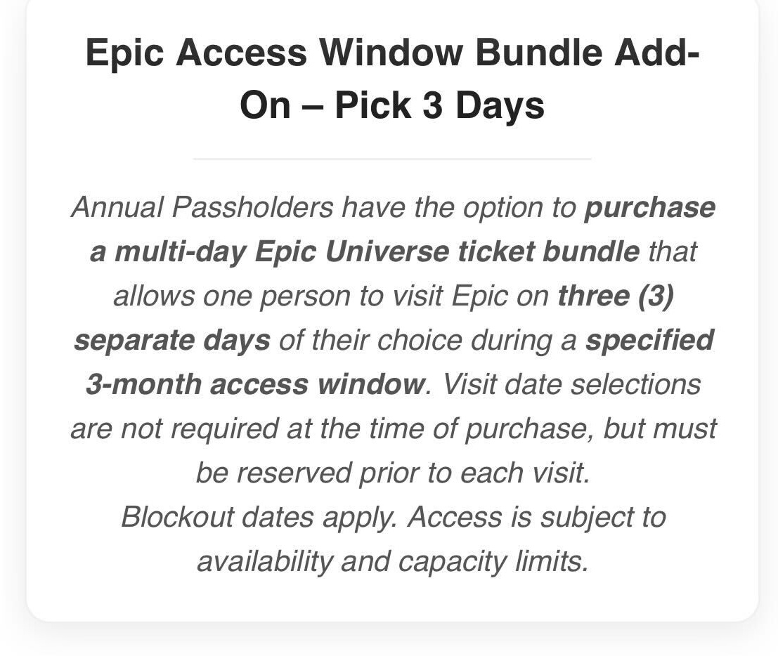 Annual Passholders have the option to purchase a multi-day Epic Universe ticket bundle that allows one person to visit Epic on three (3) separate days of their choice during a specified 3-month access window. Visit date selections are not required at the time of purchase, but must be reserved prior to each visit. Blockout dates apply. Access is subject to availability and capacity limits.