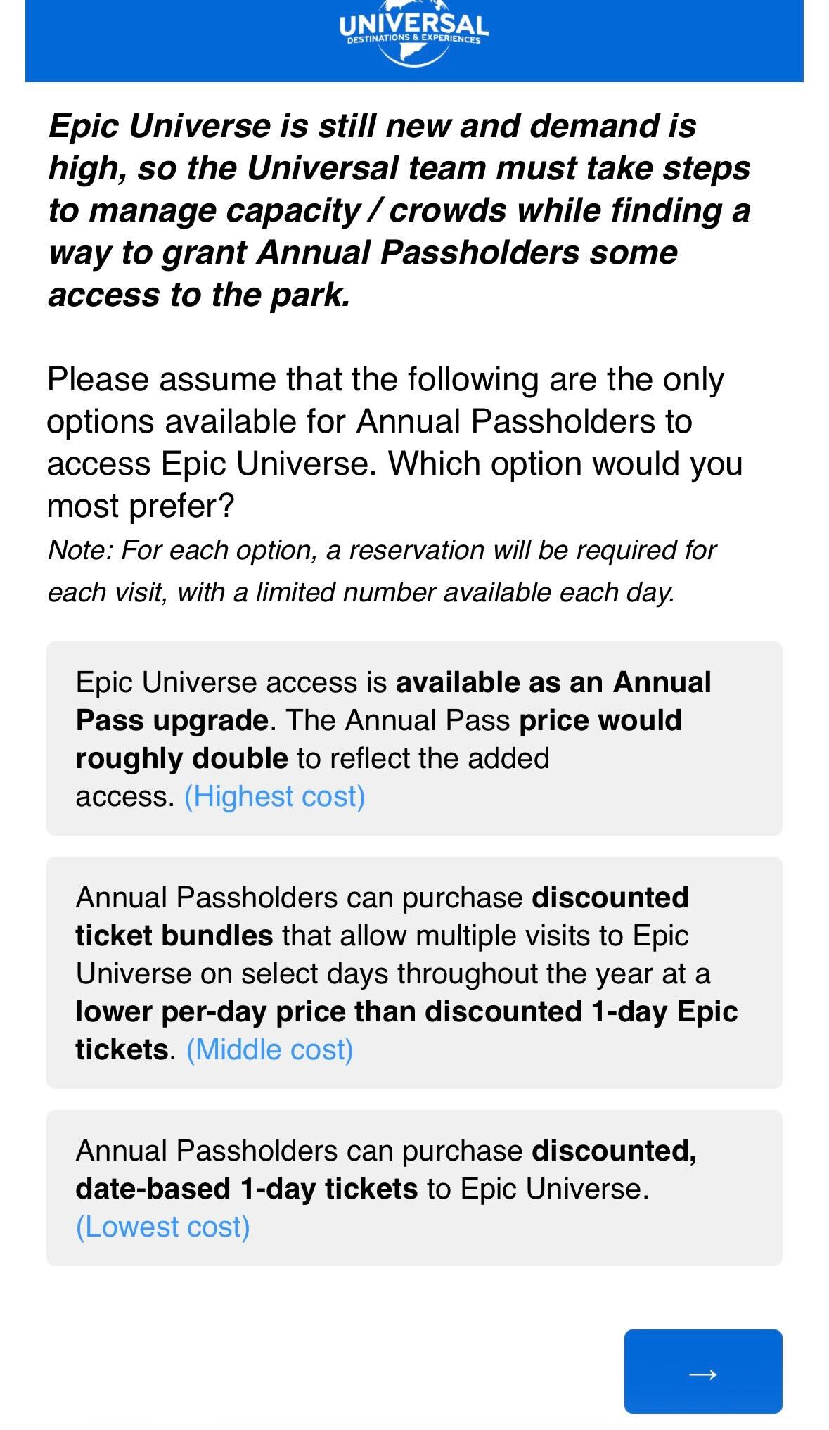 An email survey sent to Universal Orlando Annual Passholders (UOAPs) asks for opinions on three different options for incorporating Epic Universe access.