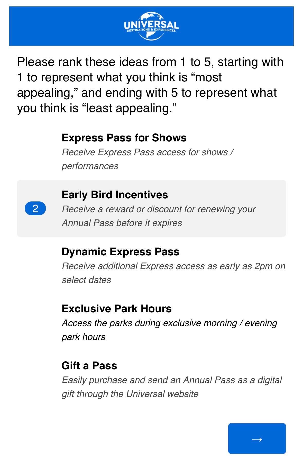 As a disclaimer, this is only a survey. There is currently no official information regarding if, when, or how Universal Orlando Resort will incorporate Epic Universe into its UOAP access.
