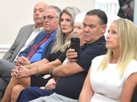 Elected officials, including County Commissioner Jeff Kinnard, Schools Superintendent Scott Hebert, County Commissioners Rebecca Bays, Janet Barek and Diana Finegan sit in the front row of the press conference Florida Chief Financial Officer Blaise Ingoglia held at the Realtors Association of Citrus County Tuesday morning. The CFO identified more than $39 million of what he calls “wasteful spending” within county government.
