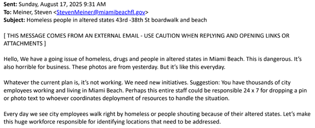 Miami Beach Mayor Steven Meiner responded to an email from a resident who raised concerns about the homeless population last August. Miami Beach Mayor Steven Meiner responded to an email from a resident who raised concerns about the homeless population last August.