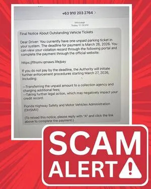The Jacksonville Beach Police Department is warning the public about scam text messages that falsely claim recipients owe money for parking tickets.