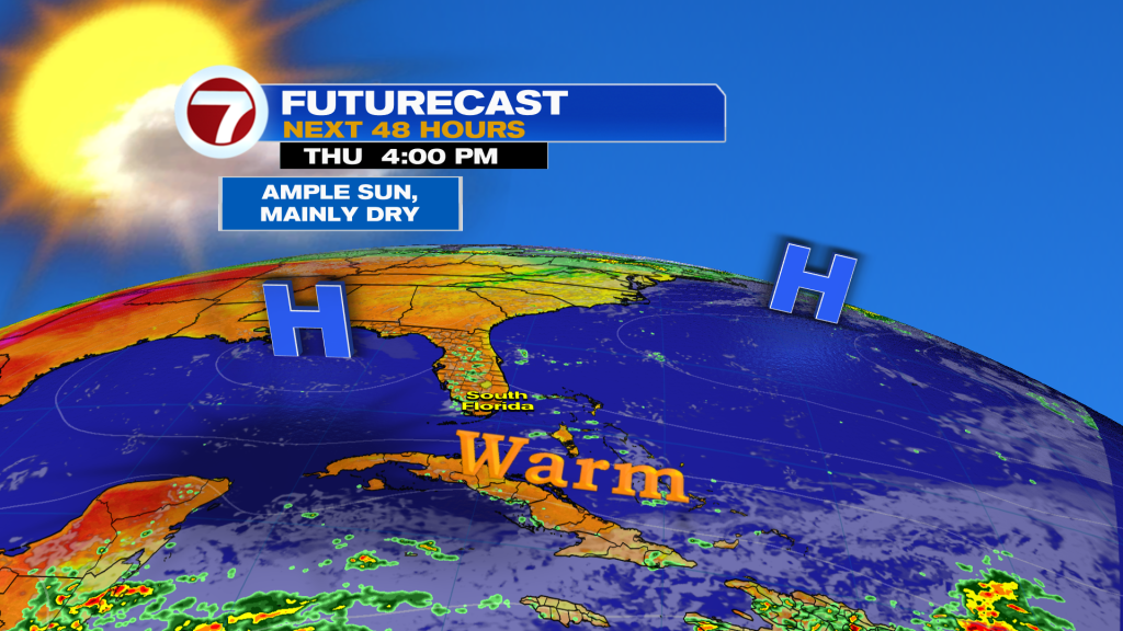 The region is still dry although from Lake Okeechobee westward, some areas of rain and even thunderstorms formed. There’s a division of drier air south (specifically south of a weak, stalled front expected to fizzle Thursday morning). What does that leave us with? High Pressure which gets reestablished on either side of the state.