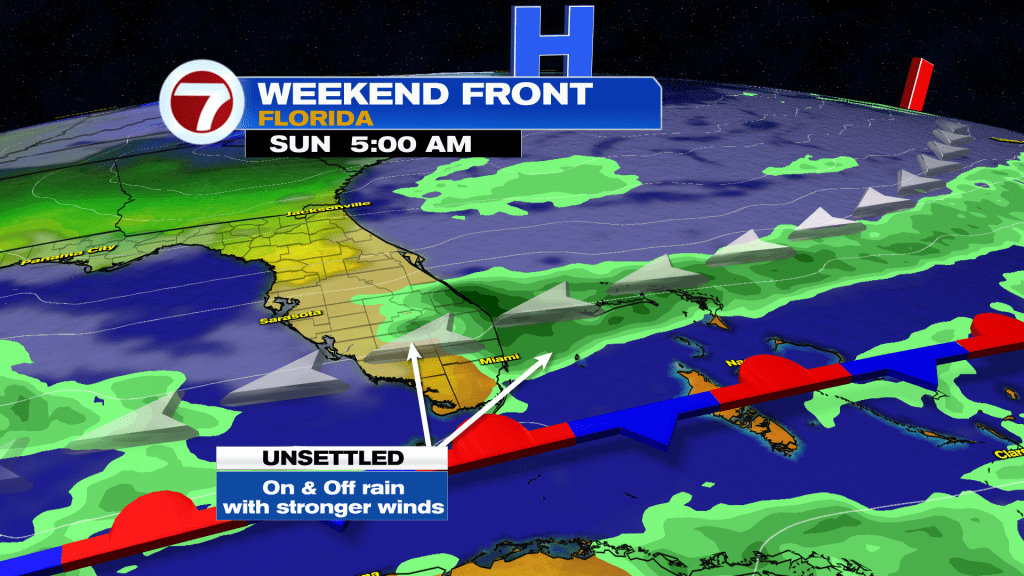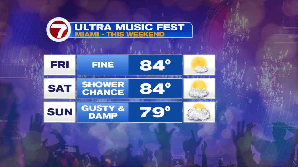 While we’re not entirely sure how far south a future Front gets, one is coming from the north and (most likely) stalling nearby or immediately south. Will it matter much? Not really. We’ll still eventually connect into more moisture around the base of distant, strong High Pressure. The High sets up along the eastern seaboard and strengthens over the western Atlantic Ocean. That will get local waters stirring with windy times for the second half of the weekend. Gusty showers will be possible, so prepare for periods of unsettled weather. Hopefully it WON’T “put a damper” on the Party known as Ultra Music Fest, the big annual event. The latest forecast calls for a decent START to the event, at least.