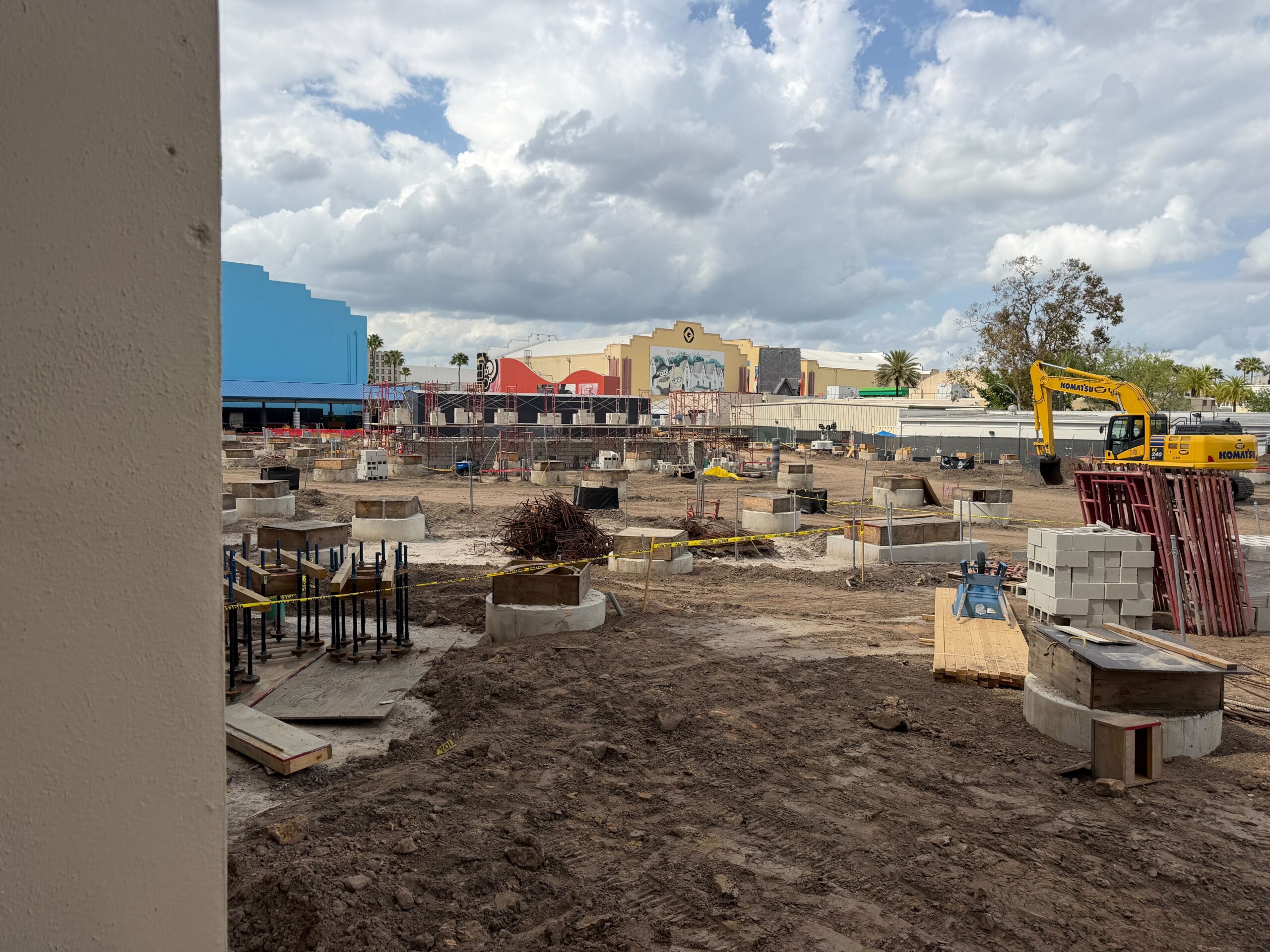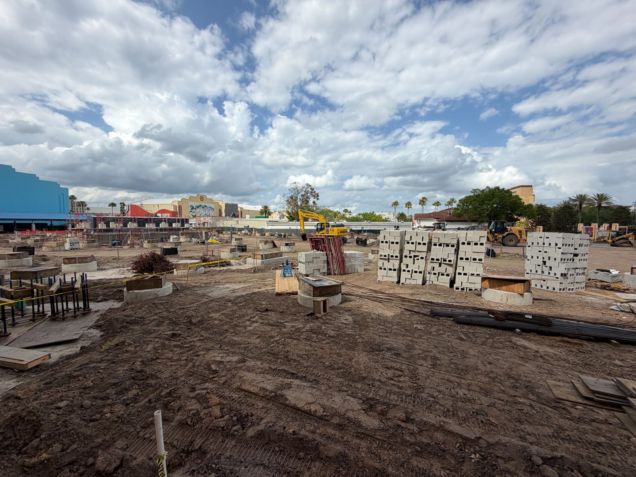 The broader area surrounding the new scaffolding remains cluttered with a wide range of construction materials, industrial equipment, and vehicles. Guests of Universal Orlando’s CityWalk or Universal Studios Florida cannot get much closer to the site than what you see here. Construction is easily visible from other areas throughout CityWalk, so we will be watching carefully for signs of track developments in the coming weeks.
