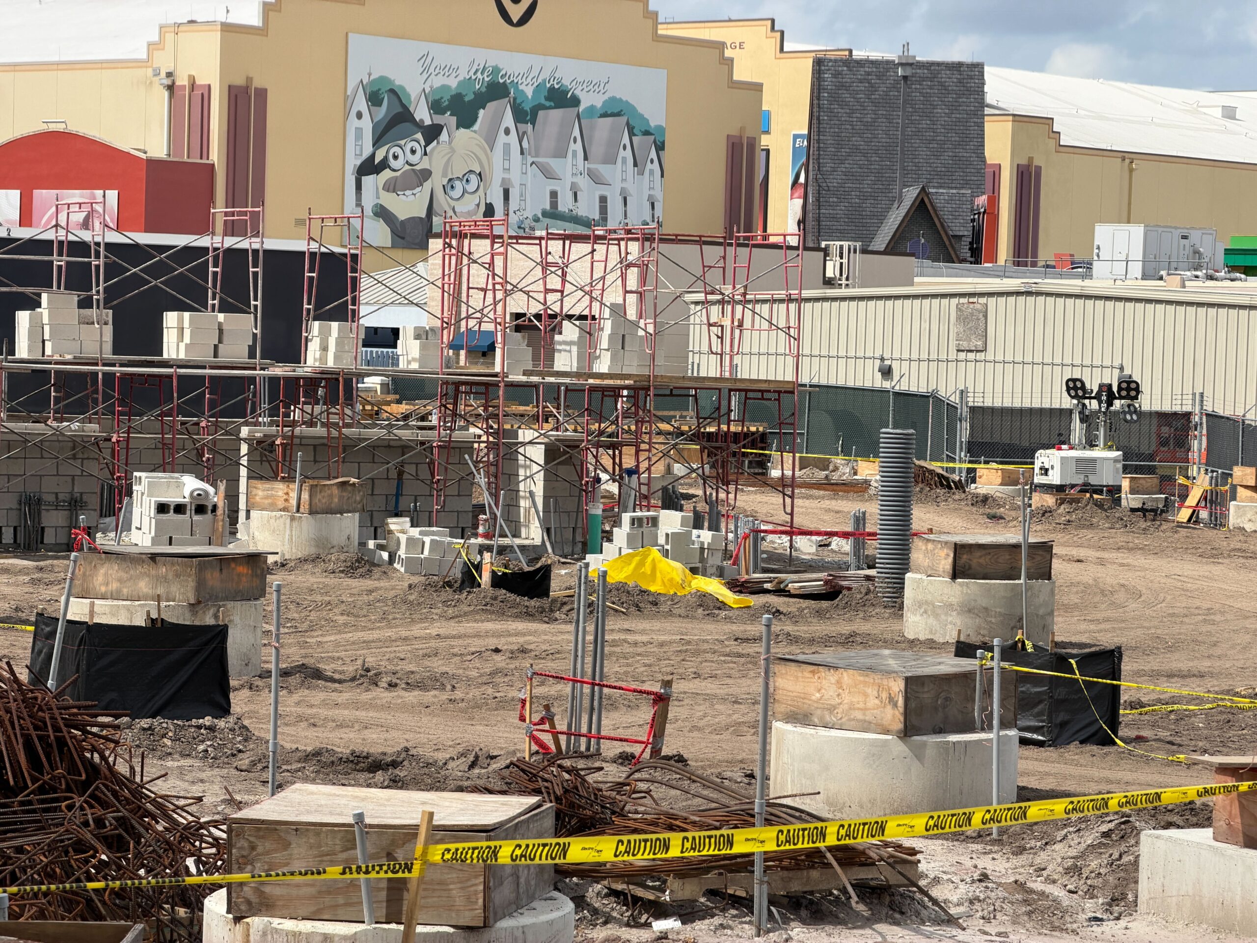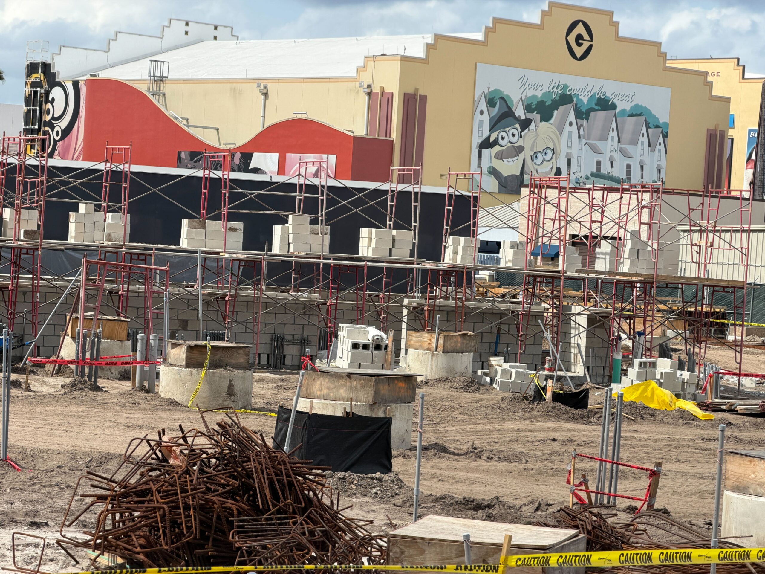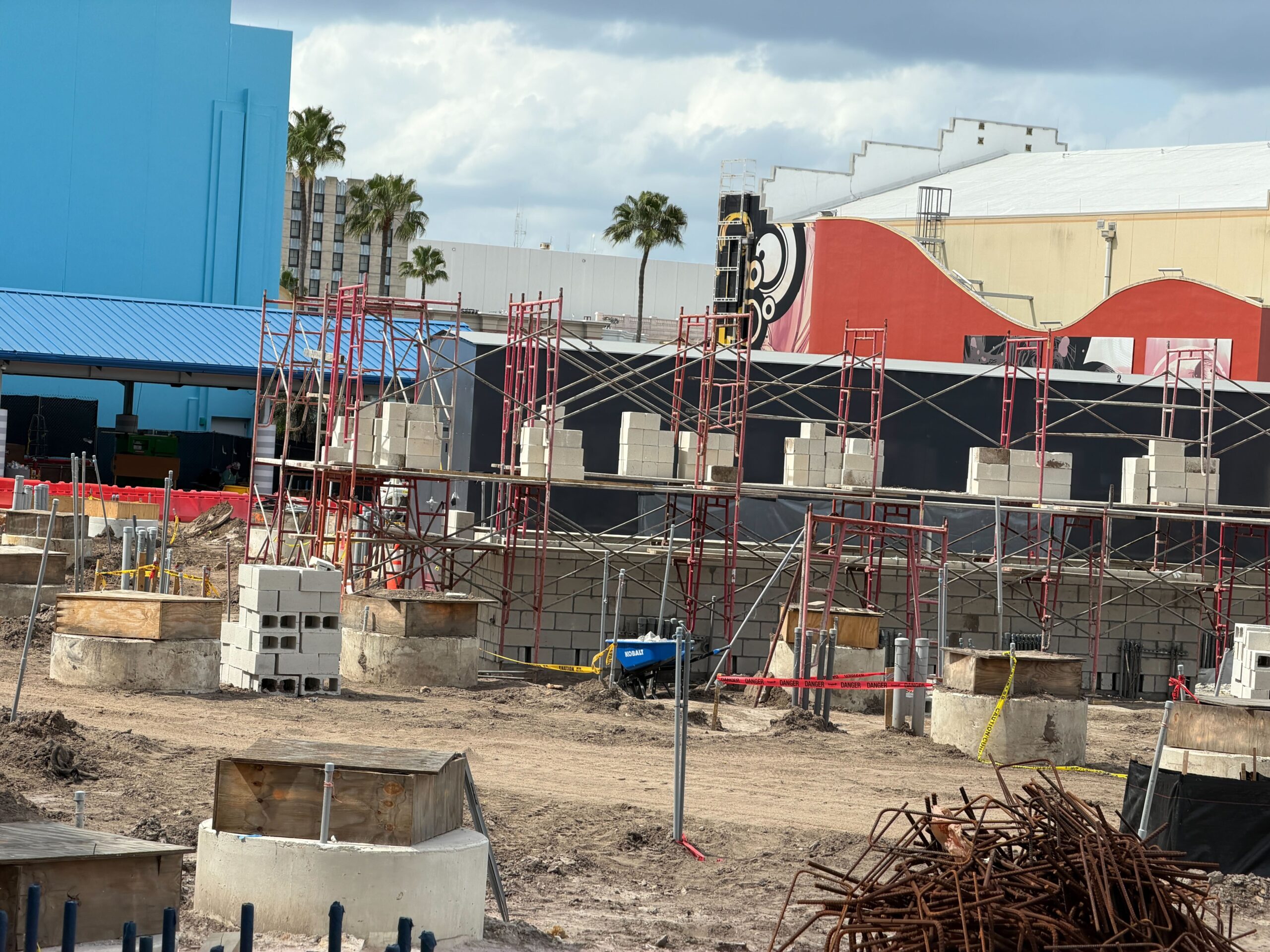 Scaffolding was seen around the site of the upcoming Fast & Furious: Hollywood Drift roller coaster at Universal Orlando Resort, as the block wall continues to rise.