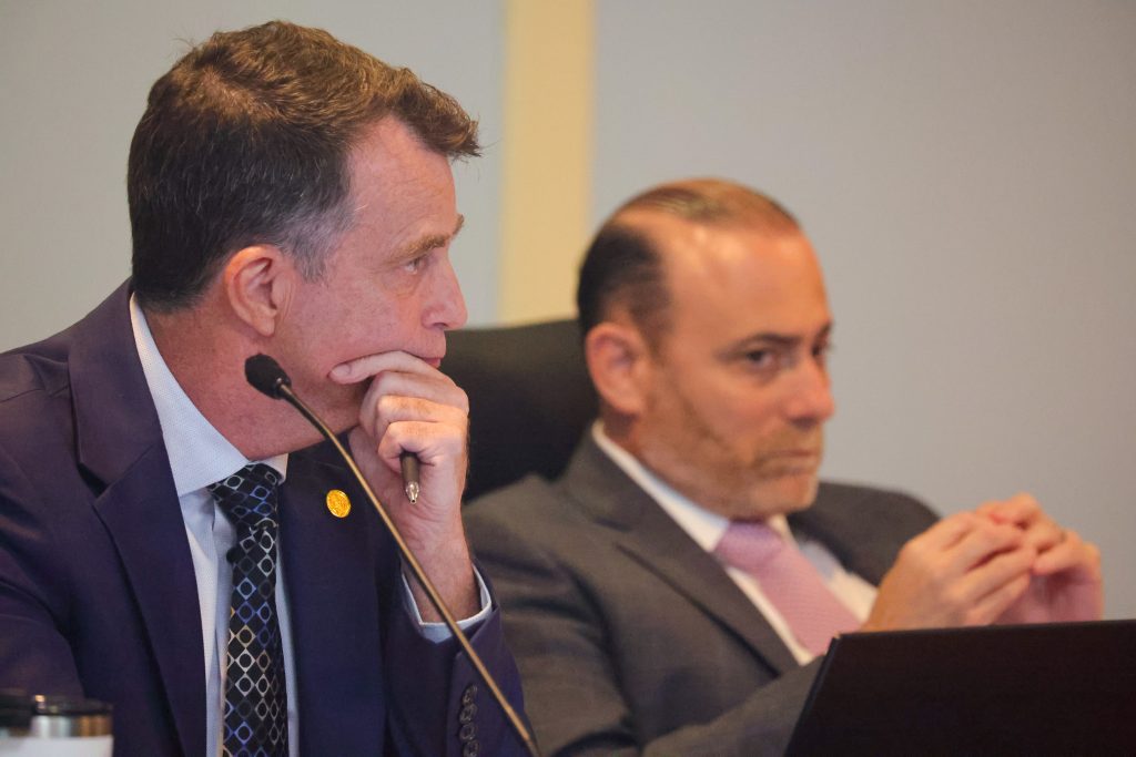 FILE — Key Biscayne Village Manager Steve Williamson and Village Attorney Chad Friedman listen to debate at Village Council meeting June 10, 2025 (KBI Photo/Tony Winton)