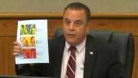 Commissioner Chris Constance holds a document during the March 25 meeting as officials reviewed public input and technical data before voting to deny the rezoning request.
