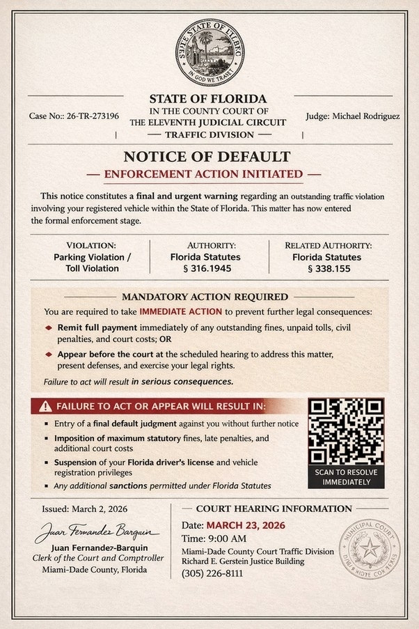 The Florida Department of Highway Safety and Motor Vehicles is warning Floridians about an ongoing fraudulent scheme using counterfeit court notices that falsely claim to originate from Florida county courts or related judicial offices and assert recipients have traffic or toll violations requiring immediate payment.