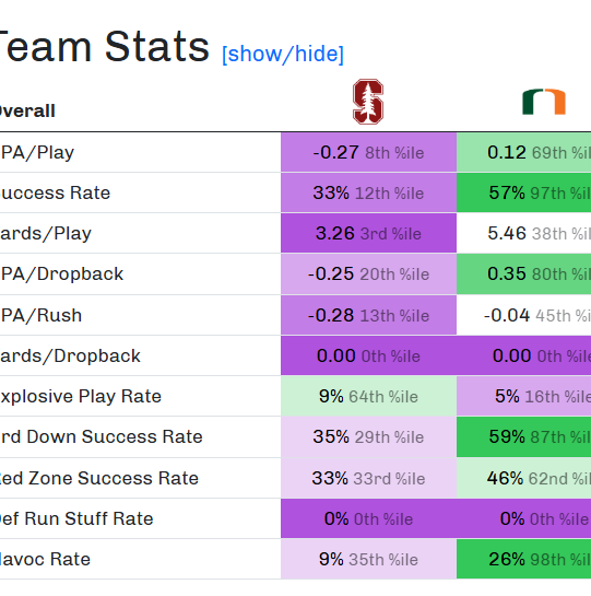 A win! I will never take this for granted.Miami is now undefeated against Stanford all-time….at 1-0 after this game.Bowl eligibility! 6 wins means Miami’s going to a bowl game. It’s a big step, but a minor note. We have bigger goals this season.WR Malachi Toney. 5 catches for 52 yards, 1 carries for 13 yards, and 2 punt returns for 73 yards, both of which probably score if the blockers were blocking and not staring at Malachi wondering what he’d do next. Another incredible night for the superstar receiver. He’s SO good.RB Mark Fletcher Jr. 23 carries for 106 yards and a career-high 3 touchdowns. This is what happens when the run game works!CB Xavier Lucas. 3 tackles, 1 TFL, 1 sack, 1 interception, 1 PBU. This is the kind of game that makes you understand why Wisconsin tried to violate his rights to keep him on their roster. Great job.LB Wesley Bissainthe. 2 tackles and an interception, which he returned to the Stanford 3.QB Carson Beck. 21/28 passing (75% completions) for 189 yards, 1 touchdown and 0 interceptions. A fairly pedestrian passing game (especially considering Stanford’s passing defense was 3rd worst in the country coming into the game), but it was a clean game and had 0 turnovers. I’ll take it.WR Tony Johnson. 3 catches for 69 yards. A nice addition to the passing game!Good contributions from Jordan Lyle, Chris Wheatley-Humphrey, and Girard Pringle Jr. in the run game.More snaps for Joshua Moore, Tony Johnson, and Jojo Trader at receiver. The first 2 had multiple catches each, but Trader wasn’t targeted. Don’t fret; the ball will find him soon.P Dylan Joyce. 1 punt for 47 yards. Bravo.Miami finally scored!!! A Carson Beck touchdown to C.J. Daniels covered 5 yards and put Miami on the board just before halftime.Miami finally got home with a sack. David Blay with the pressure, Armando Blount with the sack.Malachi Toney with the best punt return of the year to give Miami prime scoring position 2 plays later.Mark Fletcher’s 1 yard TD to put Miami ahead 14-7.Wesley Bissainthe with an interception and big return to the 3!!!! Miami scored on the next play.Miami with the kind of dominance in the 3rd quarter that, frankly, I expected to see all game against a team of Stanford’s caliber.Miami allowed 74 yards and 7 points to Stanford on the first drive of the game. They allowed 70 yards and 0 points, and forced 2 interceptions across Stanford’s final 10 drives. Combined.42 unanswered points after going down 7-0.404 yards of offense205 yards passing199 yards rushing74 total plays — this was key to get a bigger number of snaps after 2 very low snap count games against FSU and Louisville.5.5 yards per play4.5 yards per rush9.3 yards per completion10 chunk plays — 5 passes (15+), 5 runs (10+)6/6 red zone scoring — with 6 touchdowns!!!!! THIS IS HOW YOU PLAY THE GAME!!!!!!!!25 first downs8/15 on 3rd down3/5 on 4th downHeld Stanford’s starting QB to 9/21 passing with 2 INTs. Sure, the Cardinal had several drops, but this was still a job well done by the pass defense.Held Stanford to 53 total plays.Held Stanford to 4/14 on 3rd down.Held Stanford to 1/2 on 4th down.Held Stanford to 2.7 yards per play. TOTAL.Held Stanford to 2 yards per rush.Held Stanford to 8 first downs total.Won time of possession 36:42 to to 23:18 for Stanford. WOW.6 TFLs2 sacks2 interceptions — Bissainthe and LucasOnly allowed 5 TFLs0 sacks allowedBeing able to empty the bench and play multiple backups and freshmen in an ACC conference game. See, this is what happens when you score touchdowns and win big!!!Another advanced stats snapshot that tells the story of a Miami blowout win that finally had the scoreboard match the stats profile. I mean LOOK AT ALL THE DEEP PURPLE (very, very bad) ON THE STANFORD SIDE!!!! This was the blowout it should have been.The run-after-catch choices of non-Malachi Toney receivers. They continually ran inside on WR screens, when the numbers were there to run outside and score. C’mon man. Do better.Miami stalling out on their first 2 drives. Yes, we got things going, but you can’t have this when you have championship goals.Letting Stanford hang around. First of all, letting them walk down the field for a touchdown on their first drive, yuck. Then, they held the lead until the bitter end of the first half when Miami finally scored. The 35-0 difference in the 2nd half should have been even more across the whole game.5 penalties for 30 yards. Bad, yes, but better than previous weeks. So this moves up from Ugly to Bad. Let’s try for even fewer to get this up to Good in each of the final 5 games.Starting defensive lineman Akheem Mesidor tried to play, but wasn’t able to go. Injuries suck, and we don’t need them to one of our best players.Miami’s first drive ended with a missed field goal. It’s bad enough that the drive stalled due to penalties (plural), it’s infinitely worse that it stalled AND went scoreless. Woof.More. Missed. Tackles.OH hey look. Miami gave up an opening-drive touchdown to go down 7-0 to Stanford.Going for it on 4th and 3 from the Stanford 30, C.J. Daniels had one of the worst drops I’ve ever seen. You cannot have that.This is the 3rd time this season I’ve mentioned an ugly Daniels drop. Sure, he’s the leading receiver and has a bunch of great catches to his credit, but we cannot keep talking about bad drops in spots that matter for #7.Another failed 4th down attempt at the Stanford 21 a few drives later. Center got manhandled by a backup/rotation Stanford player. You CANNOT have that.