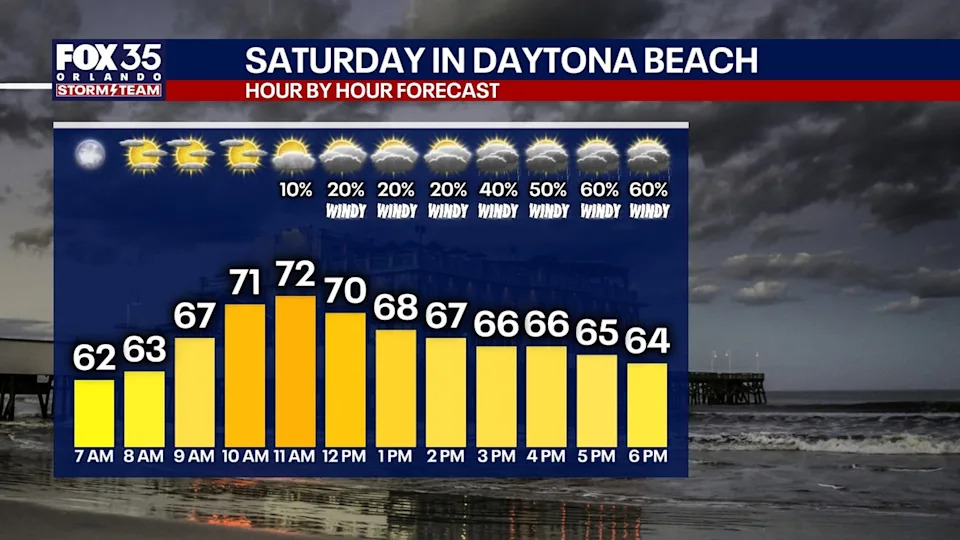 Arrival: Clouds and wind will first hit the Daytona and Flagler Beach areas, moving southwest toward Central Florida.