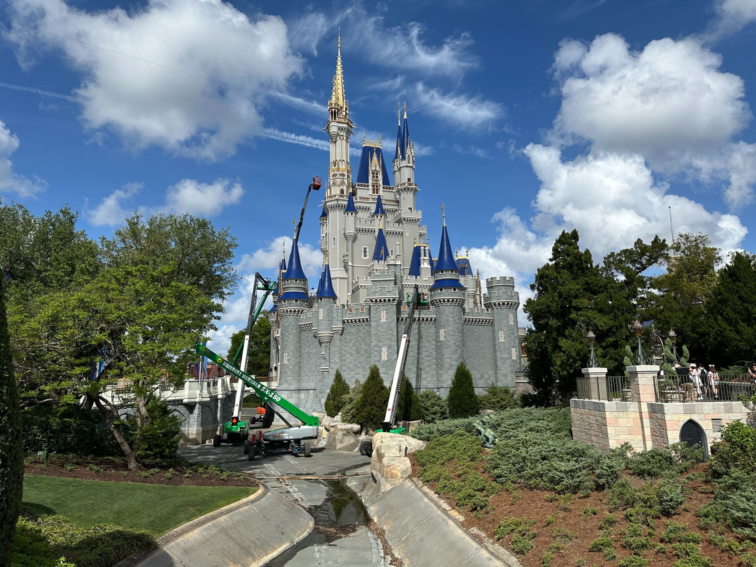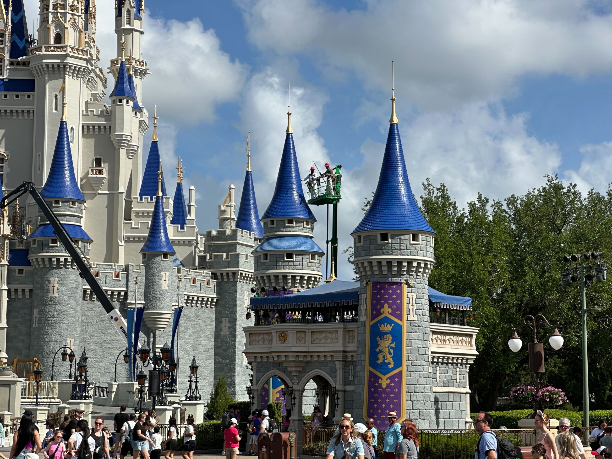 Crew members have been working in the early mornings. On Wednesday, April 1, we saw multiple people in lifts working on multiple blue towers, as well as the front of the castle.