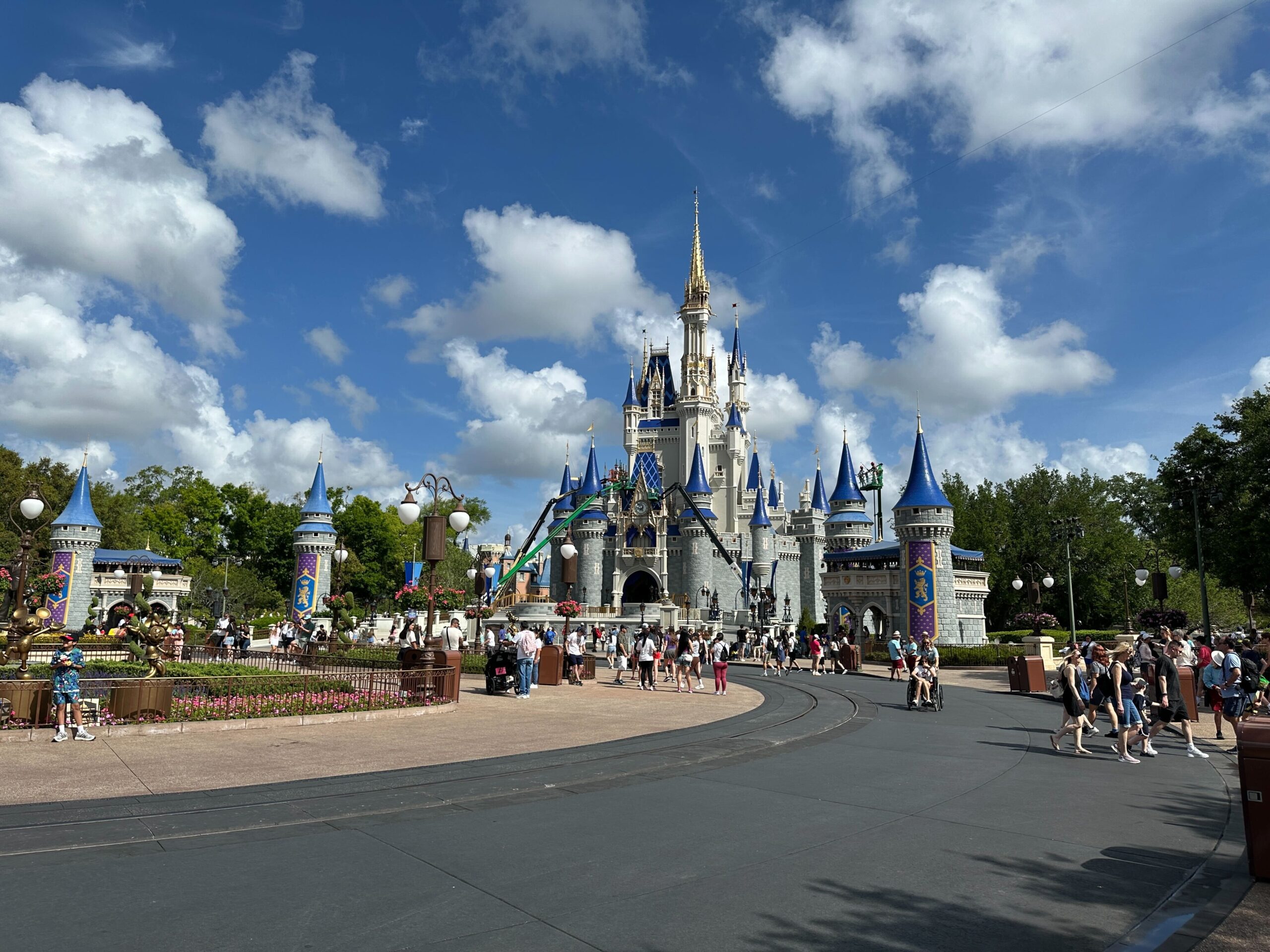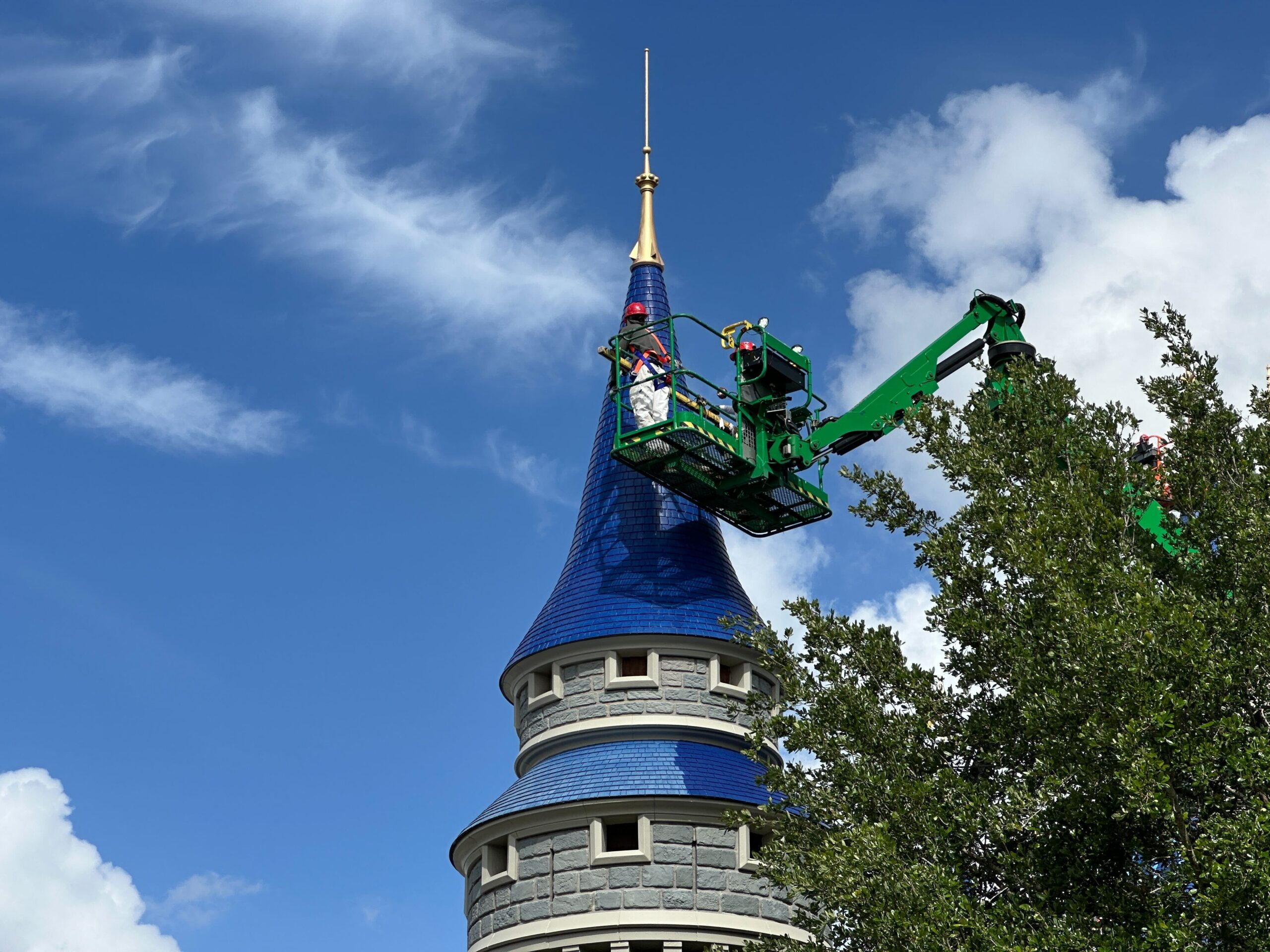 Crews continue to focus on the blue roofing of Cinderella Castle at Magic Kingdom, moving toward the towers on the corners at the front of the castle.