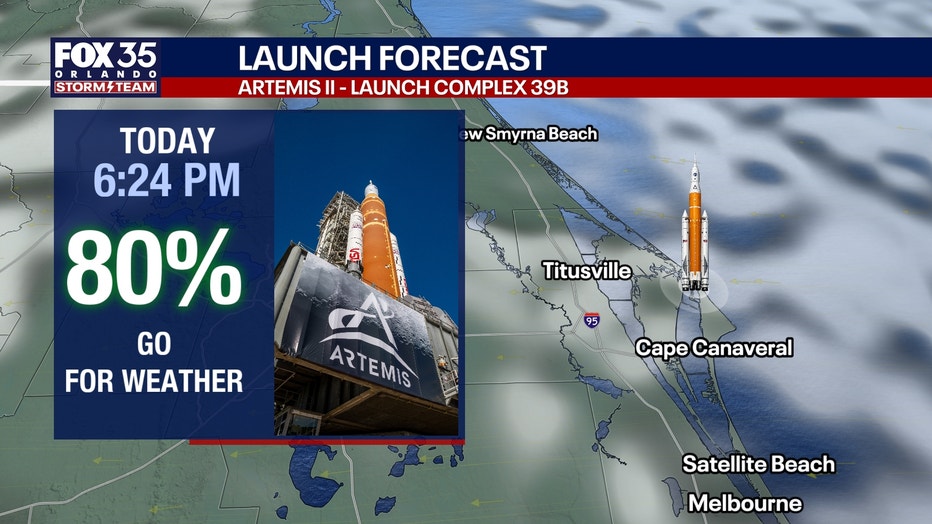 The FOX 35 Storm Team says there will be a few showers possible this afternoon, but the rain should clear out before launch time.Â