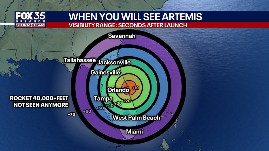 People across Florida and southern Georgia will have a chance to see Artemis II fly through the night sky into space. The map shows who will be within range to potentially see Artemis. The +10 number means those within that ring will be able to see the rocket 10 seconds after it launches.