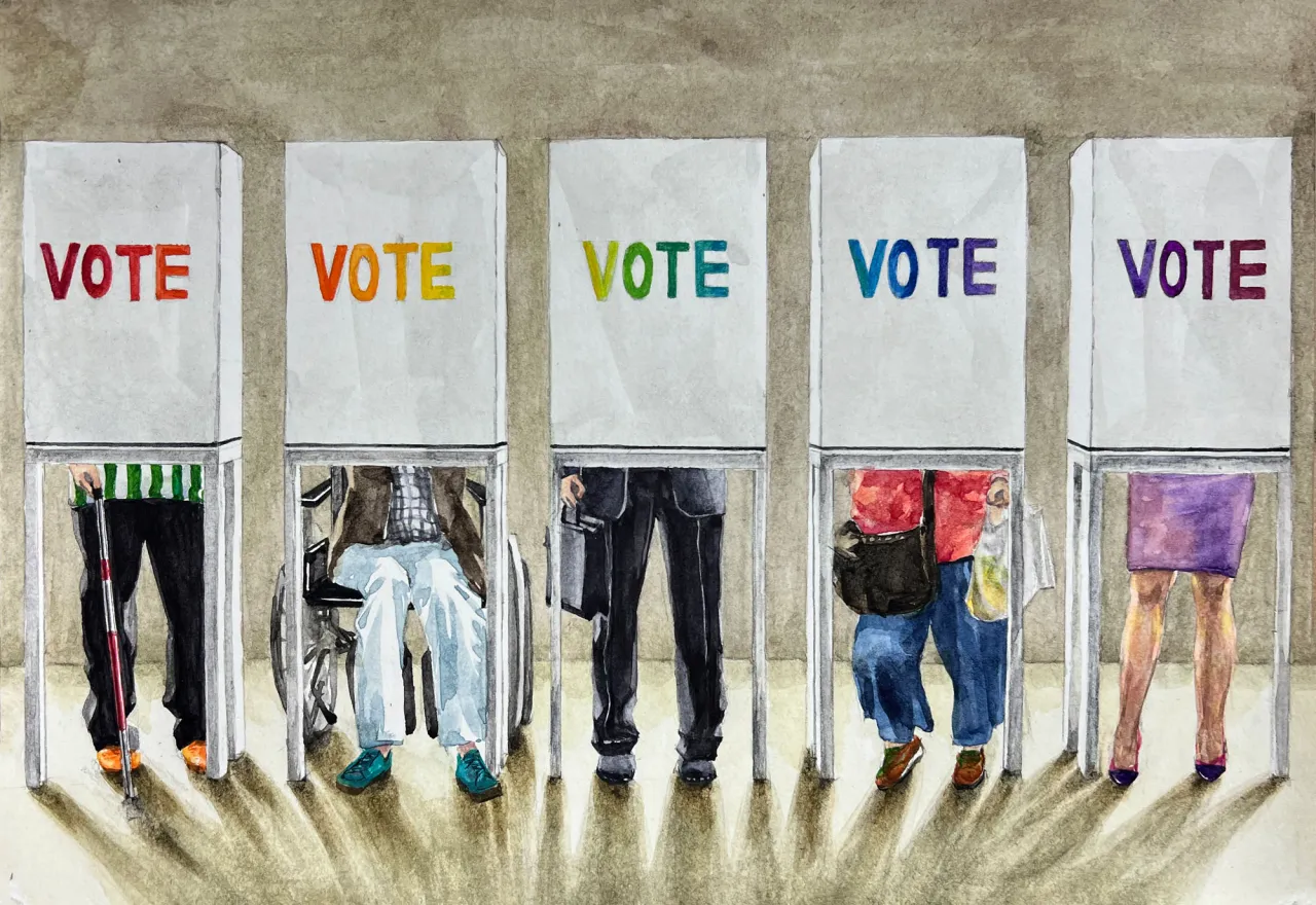 “In this thoughtful watercolor, only the lower halves of voters are visible — a person with a cane, someone in a wheelchair, a professional, a parent, a person in heels — while the word ‘VOTE,’ repeated in shifting colors, unites them,” Embracing