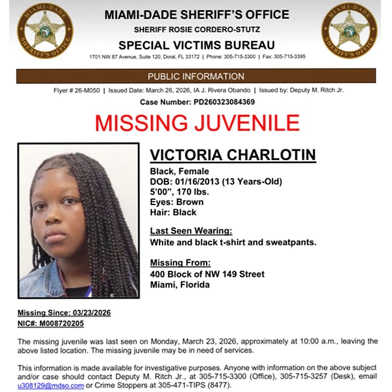 Deputies released a “Missing Juvenile” flyer with a photo of Victoria Charlotin announcing that she was last seen at about 10 a.m., on Monday, in the 400 block of Northwest 149 Street.