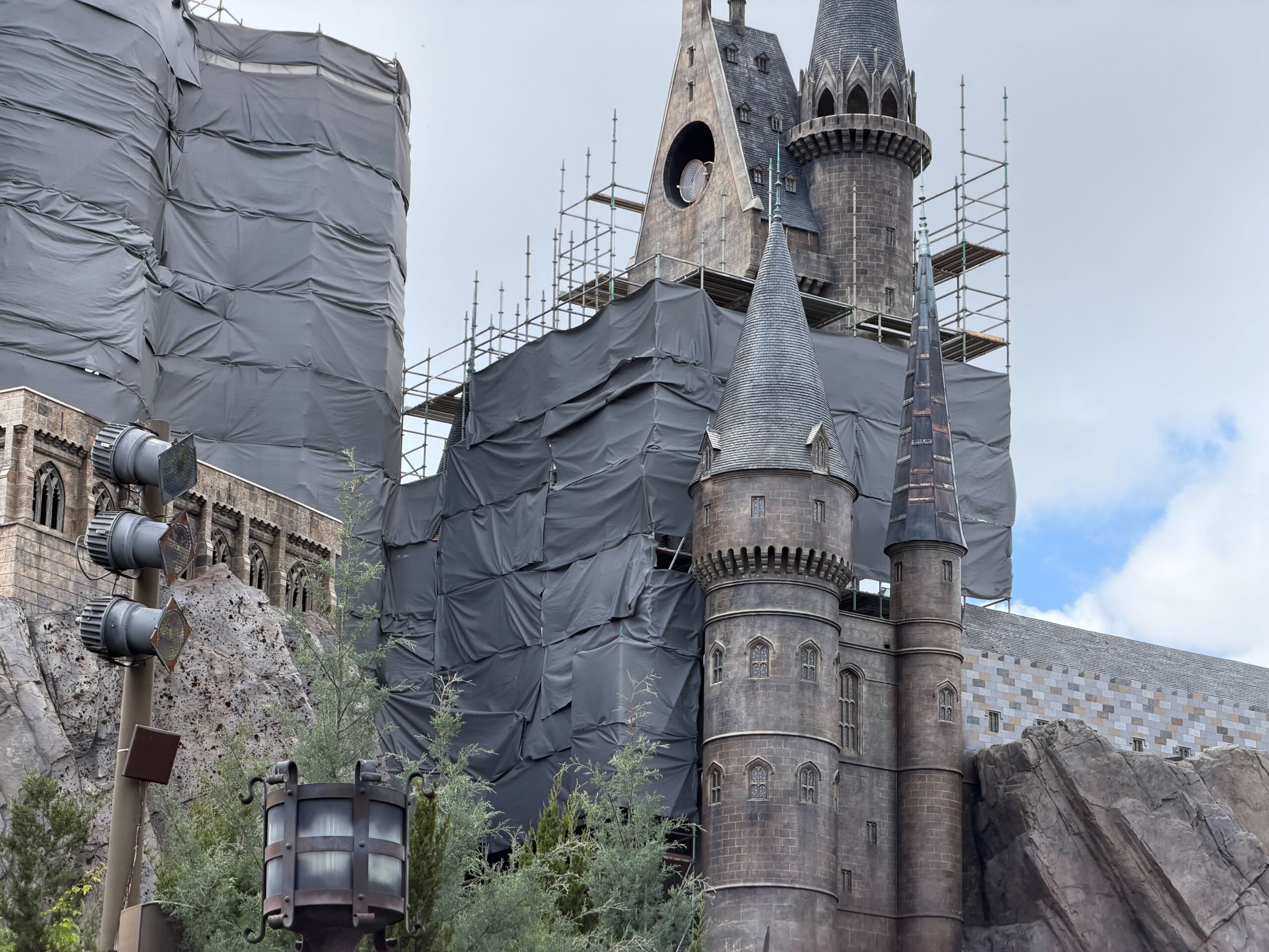 The iconic Hogwarts Castle in The Wizarding World of Harry Potter – Hogsmeade is being refurbished. Scaffolding wrapped in gray scrim blocks most of the castle’s towers from view.